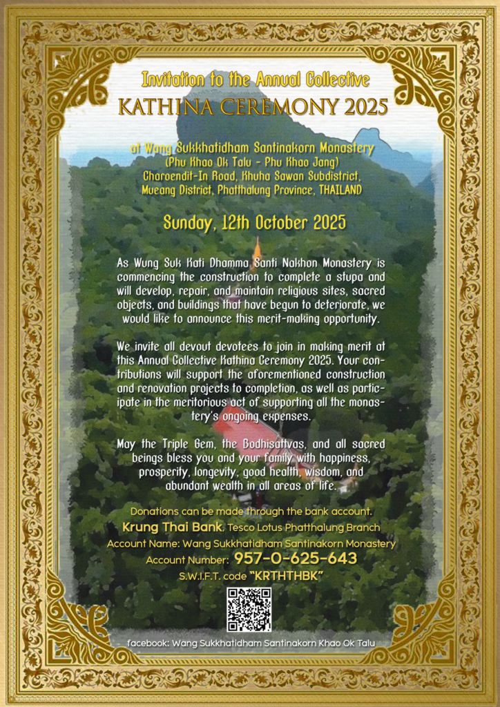As Wung Suk Kati Dhamma Santi Nakhon Monastery is commencing the construction to complete a stupa and will develop, repair, and maintain religious sites, sacred objects, and buildings that have begun to deteriorate, we would like to announce this merit-making opportunity.